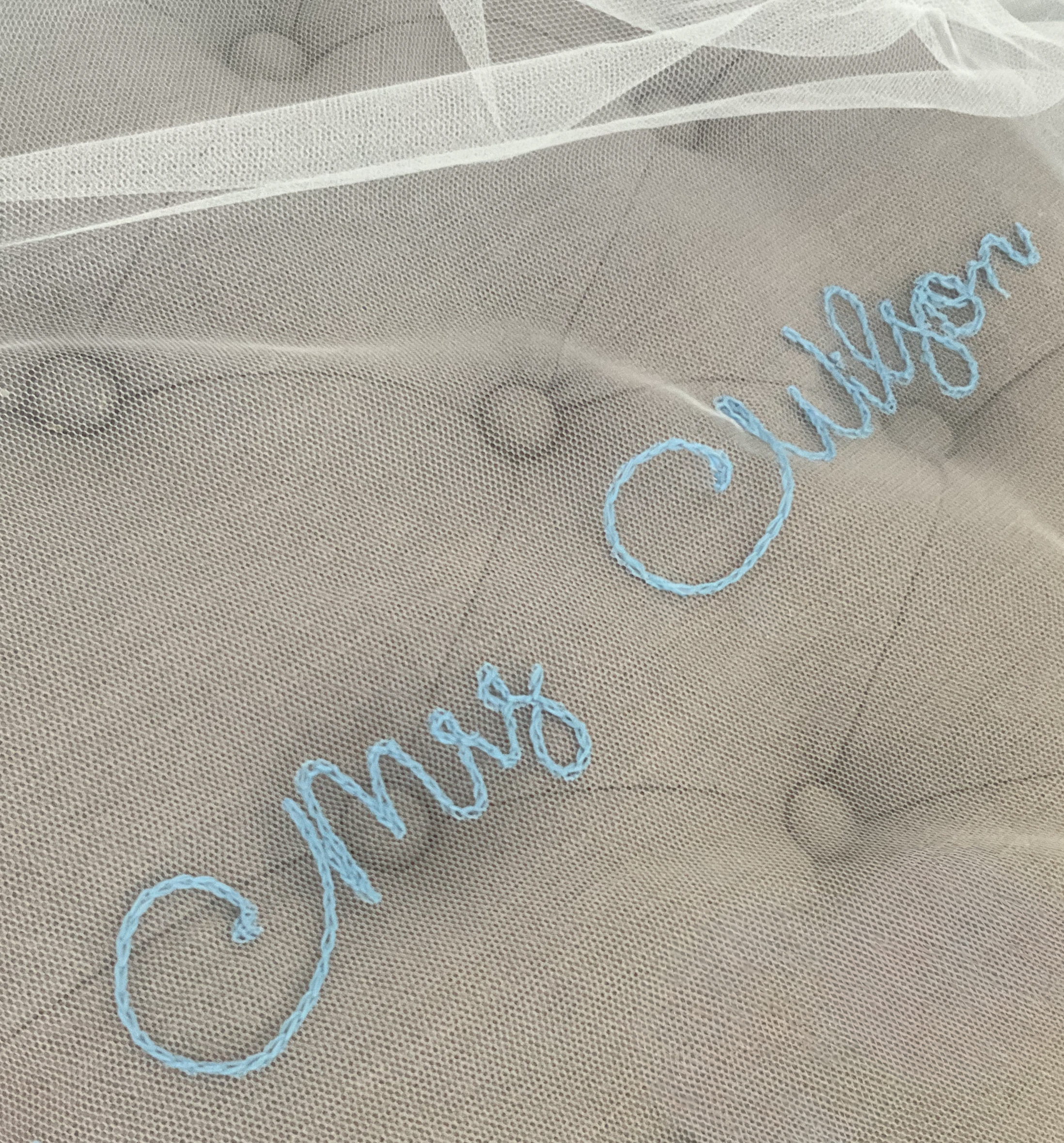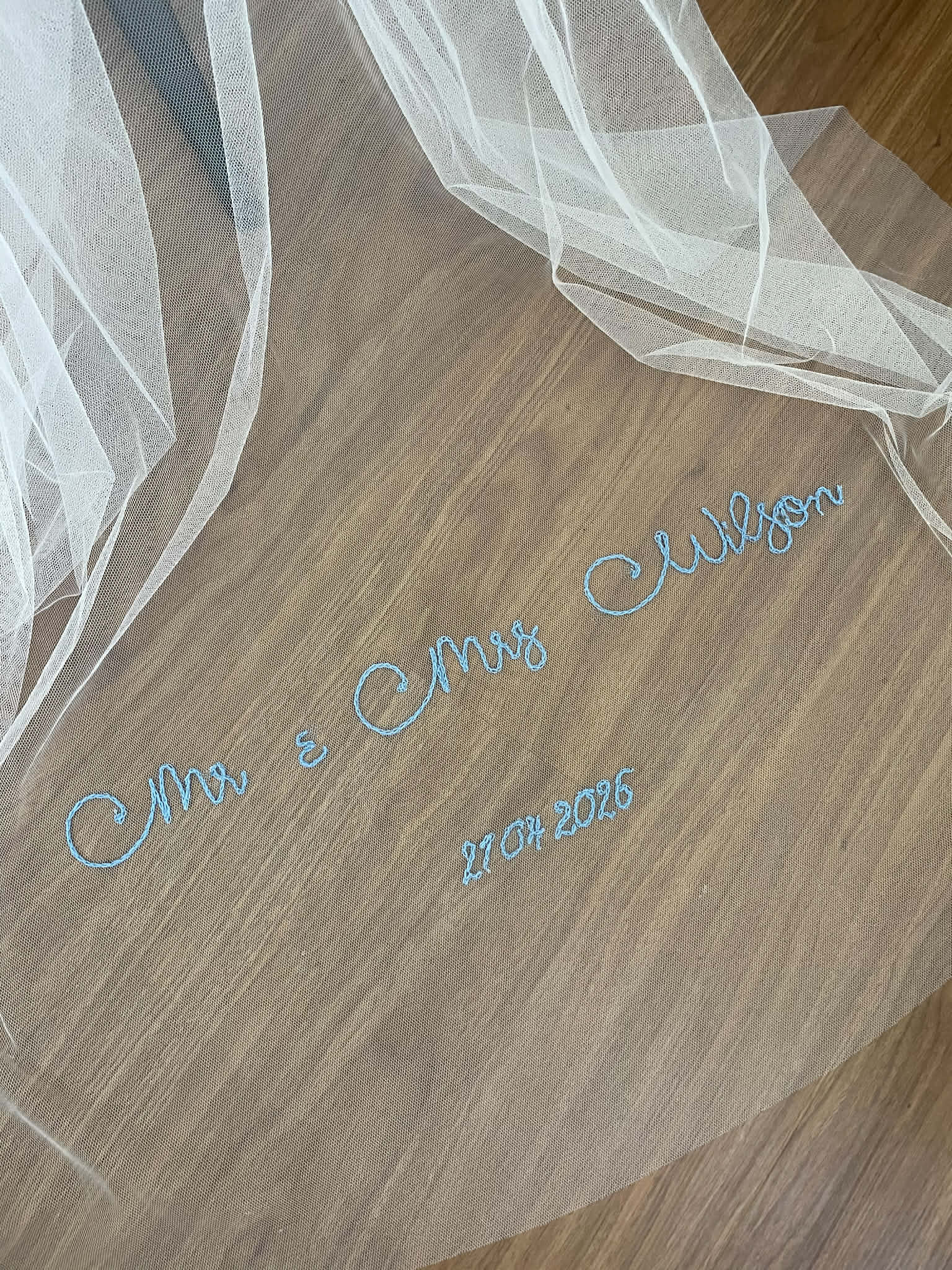 Your veil will be hand stitched using rich embroidery threads.  We have a vast selection of gorgeous coloured threads or simple complementing veil colours to choose from that your names, initials, wedding date, or meaningful words and phrases could be embroidered with